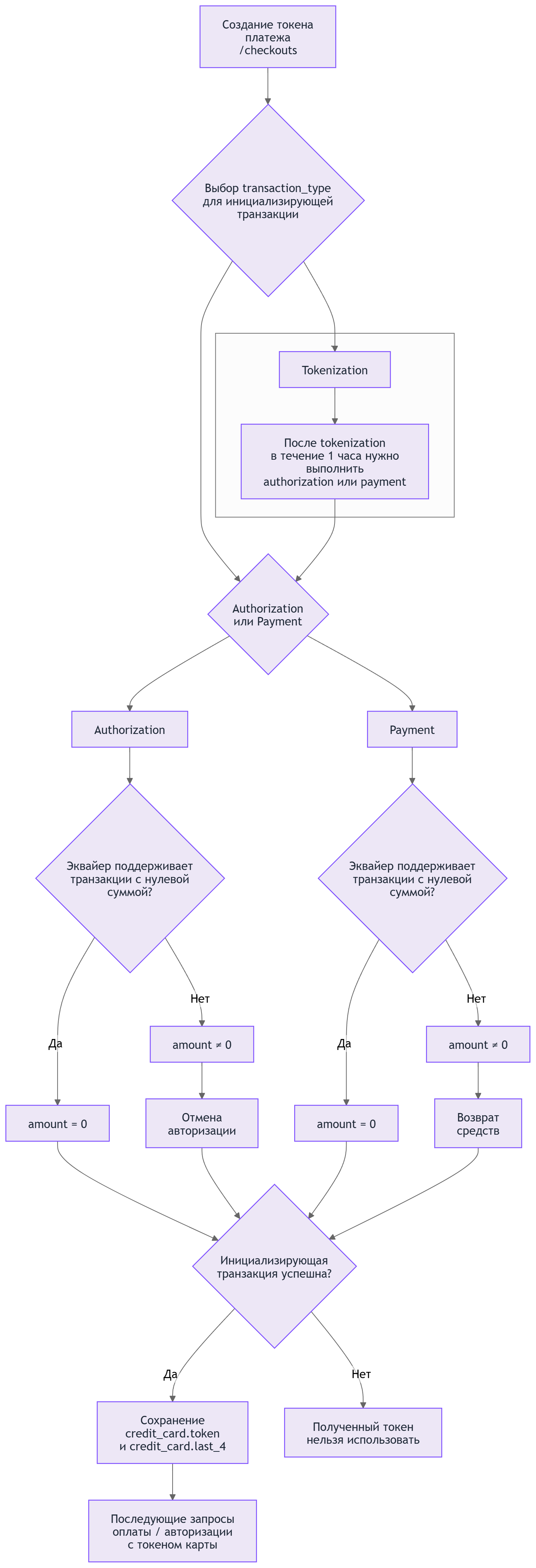 Обратите внимание, что при использовании транзакции токенизации в качестве инициализирующей, последующую транзакцию необходимо совершить в течение часа. В противном случае потребуется повторная проверка 3-D Secure с участием покупателя.